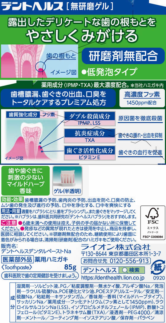ライオン デントヘルス 薬用 ハミガキ 無研磨ゲル 85g 1個(ご注文単位1個)【直送品】