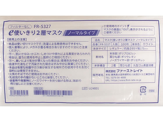 ファーストレイト e使いきり2層マスク ノーマルタイプ 100枚 FR-5327 1袋(ご注文単位1袋)【直送品】