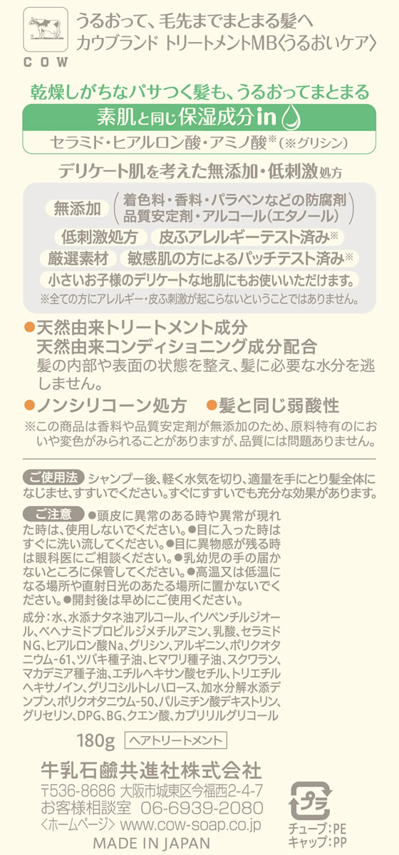 牛乳石鹸 カウ 無添加トリートメント うるおいケア 180g 1本(ご注文単位1本)【直送品】