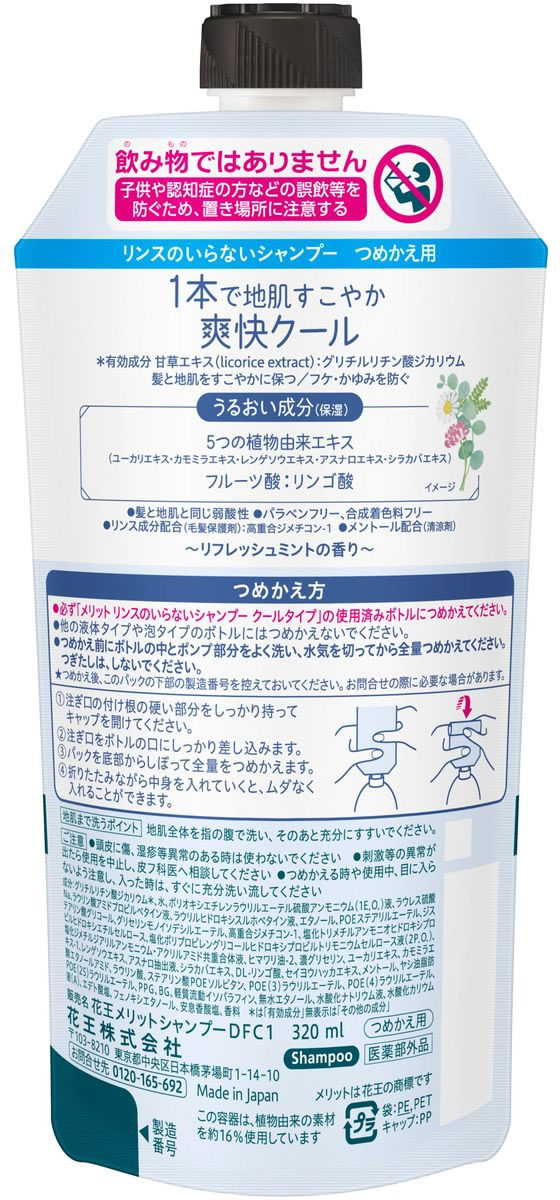 KAO メリット リンスのいらないシャンプー クール つめかえ用 320mL 1個(ご注文単位1個)【直送品】