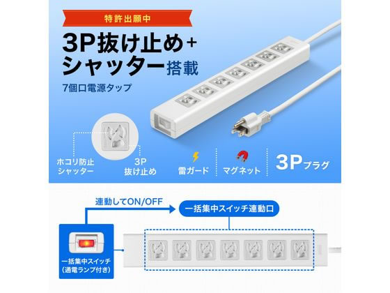 サンワサプライ 抜け止めシャッタータップ 3P 7個口3m TAP-F37SH-3Z 1個(ご注文単位1個)【直送品】