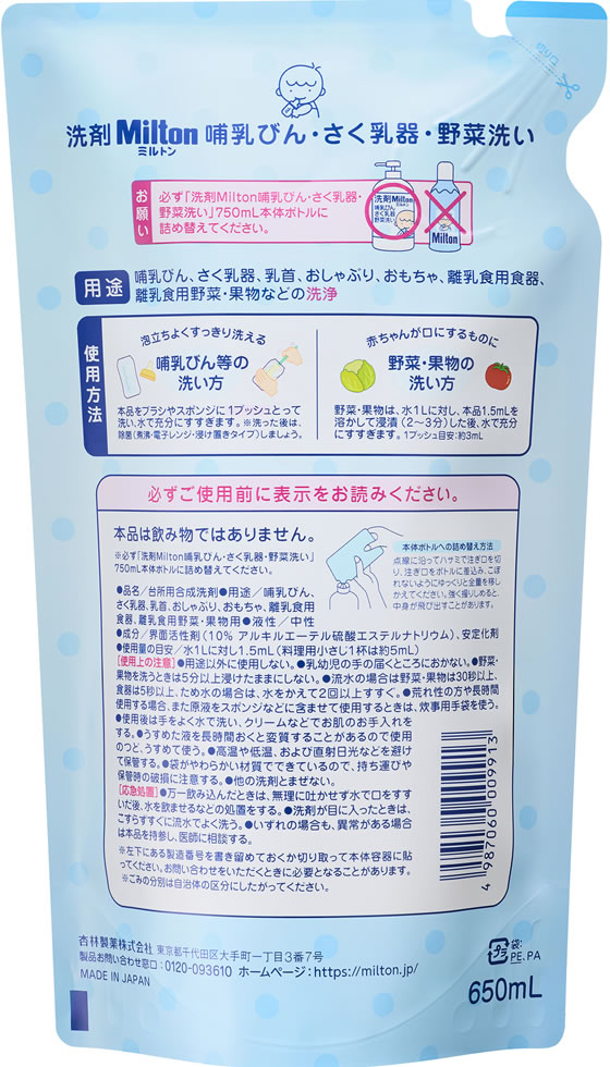 杏林製薬 洗剤ミルトン 哺乳瓶・搾乳器・野菜洗い 詰替650mL 1個(ご注文単位1個)【直送品】