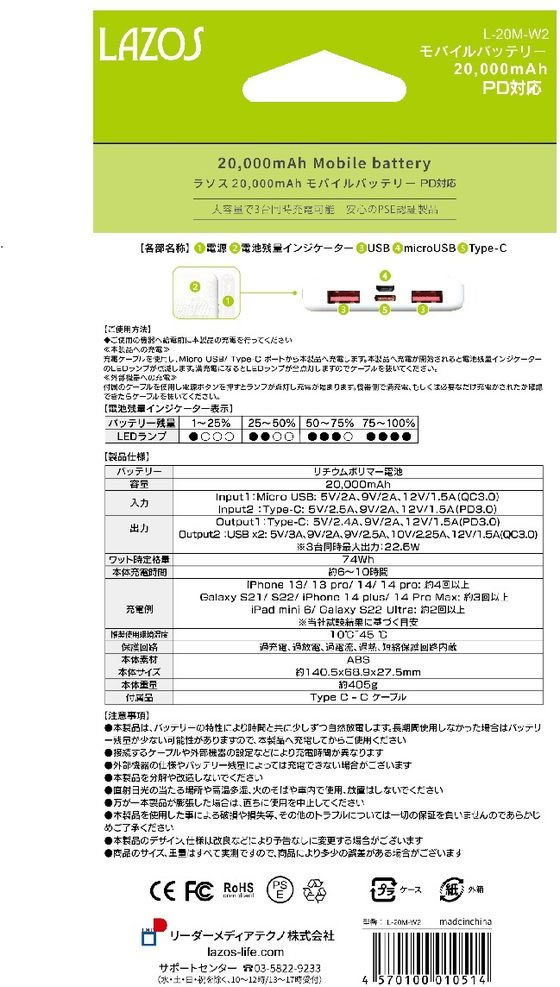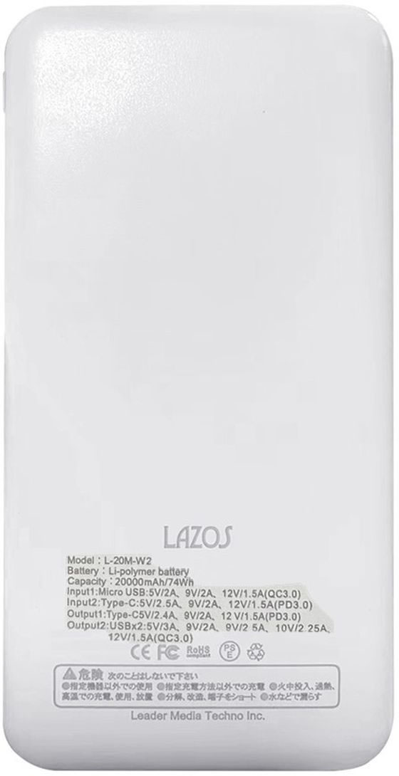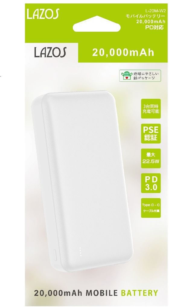 Lazos 20000mAh充電器USB(QC3.0)+TypeC(PD) L-20M-W2 1個(ご注文単位1個)【直送品】