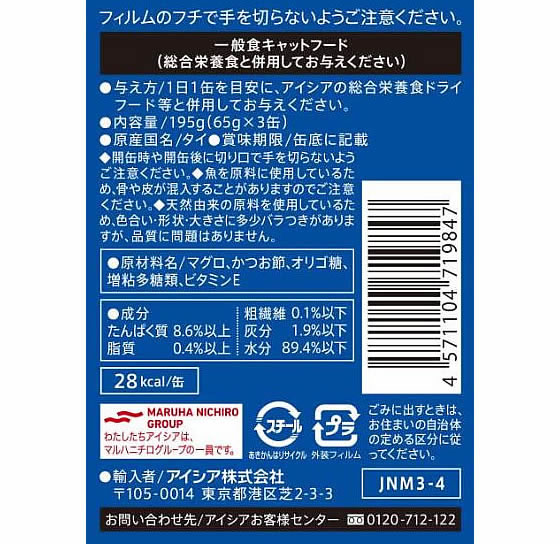 アイシア 純缶 ミニ3P かつお節入りまぐろ 195g(65g×3缶) 1パック(ご注文単位1パック)【直送品】