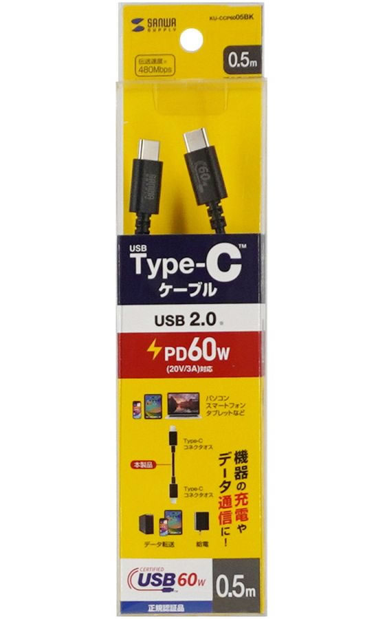 サンワサプライ USB 2.0 Type-Cケーブル PD60W 0.5m ブラック 1本(ご注文単位1本)【直送品】