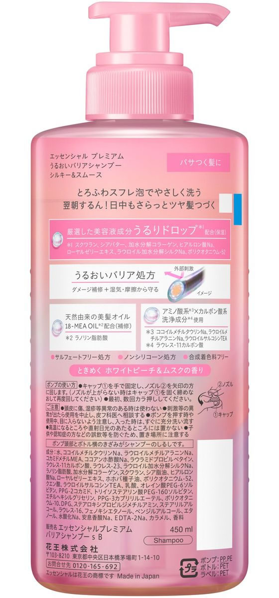 KAO エッセンシャル プレミアム バリアシャンプー シルキー ポンプ 450mL 1本(ご注文単位1本)【直送品】