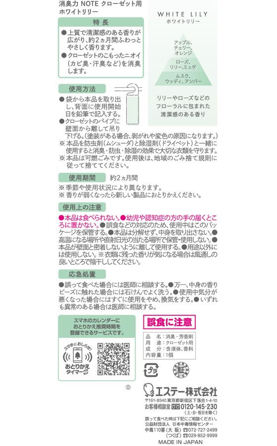エステー 消臭力 NOTE クローゼット用 ホワイトリリー 1個(ご注文単位1個)【直送品】