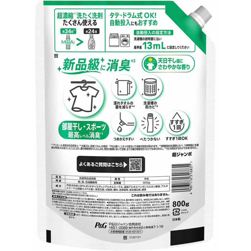 P&G アリエールミライ 消臭プラス 部屋干し 詰替 超ジャンボ 800g 1個(ご注文単位1個)【直送品】