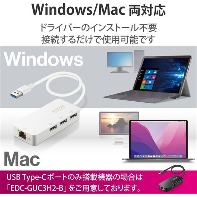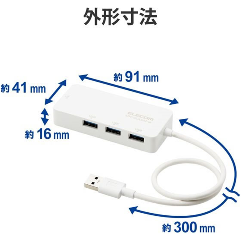 エレコム 有線LANアダプター USBハブ付 EDC-GUA3H2-W 1個(ご注文単位1個)【直送品】