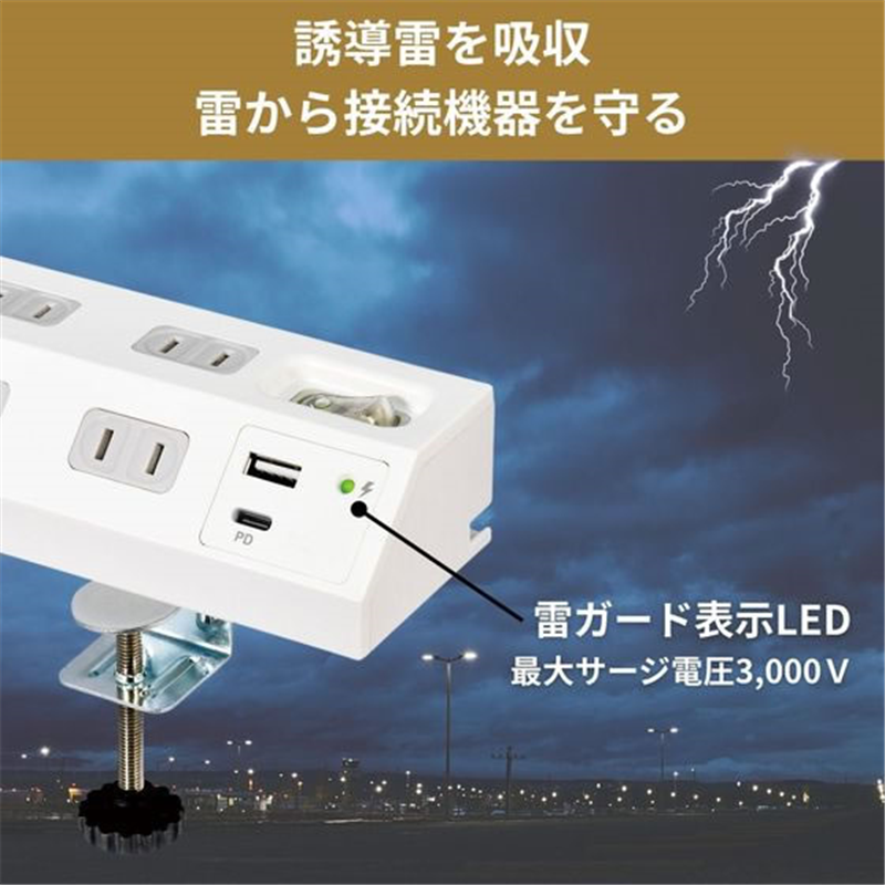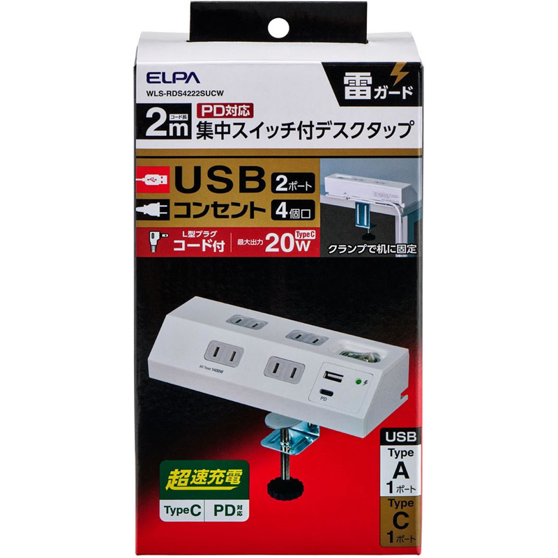 ELPA 耐雷丸形 4P 2m USBタップ WLS-LS402RUSB(W) 1個(ご注文単位1個)【直送品】