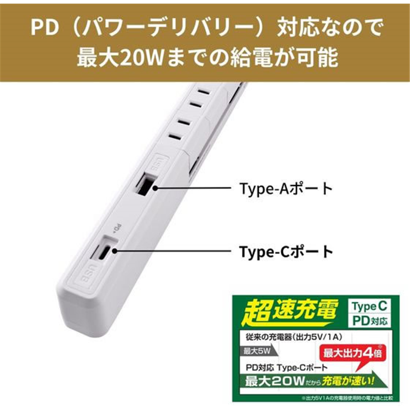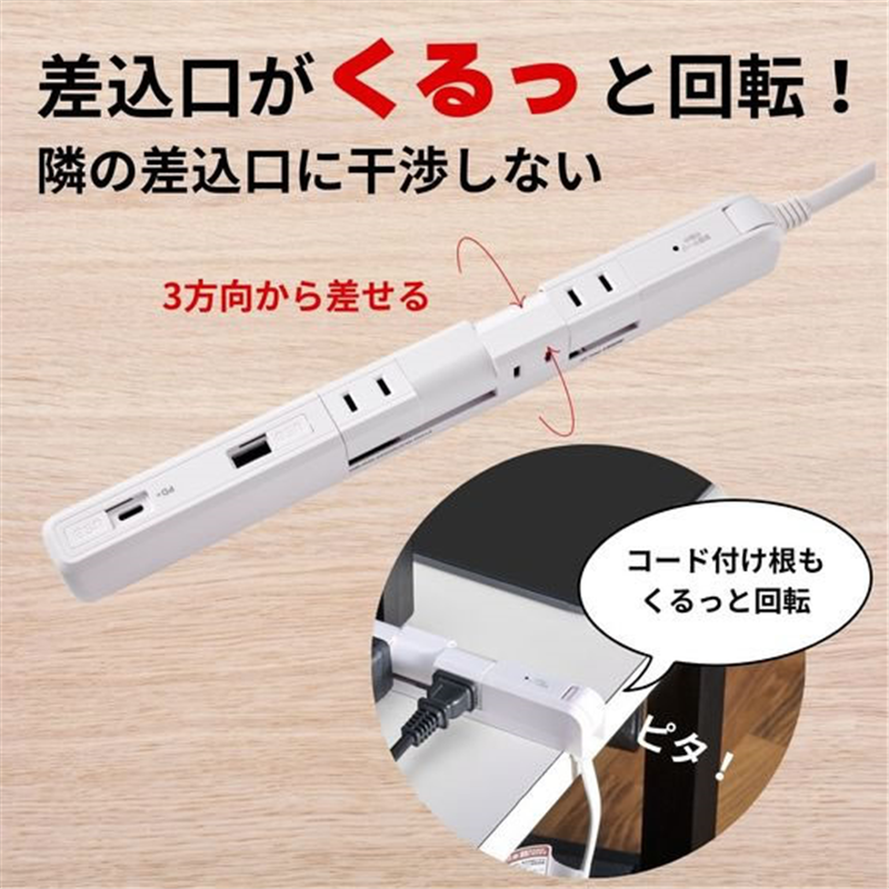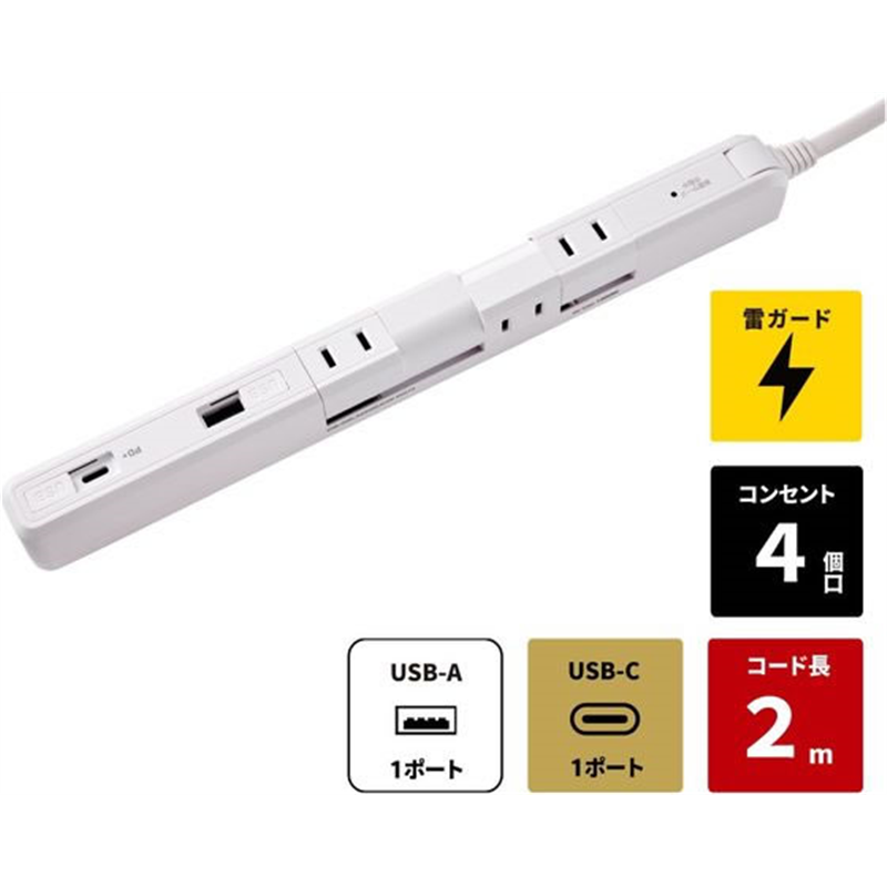 朝日電器 耐雷スリム回転USBタップ4コ口2m USBAC PD対応 白 1個(ご注文単位1個)【直送品】