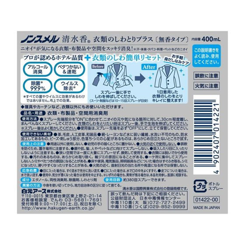 白元アース ノンスメル清水香 衣類のしわとりプラス 400mL 1本(ご注文単位1本)【直送品】
