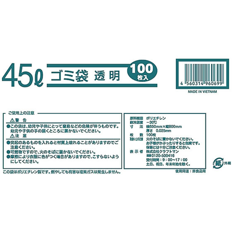 クラフトマン 業務用 ゴミ袋 透明 箱入 45L 100枚 HK-096 1箱(ご注文単位1箱)【直送品】