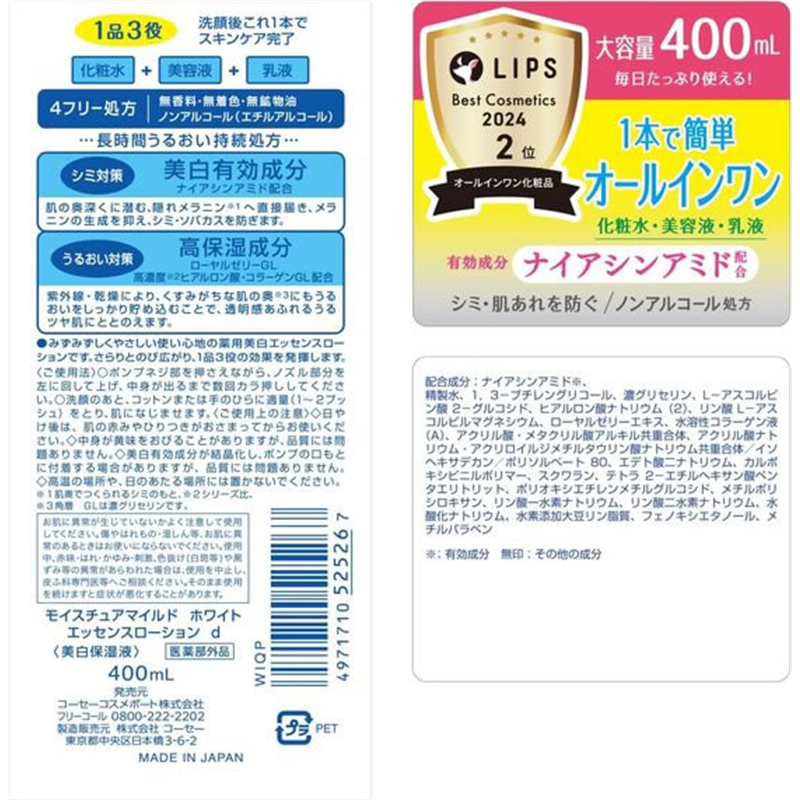 コーセーコスメポート モイスチュアマイルド ホワイト パーフェクトエッセンス 400mL 1個(ご注文単位1個)【直送品】