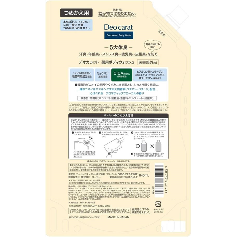 コーセーコスメポート デオカラット 薬用ボディウォッシュ 詰替用 840mL 1個(ご注文単位1個)【直送品】