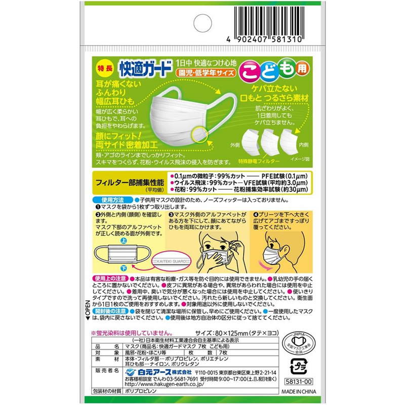 白元アース 快適ガードマスク こども用 7枚 1袋(ご注文単位1袋)【直送品】