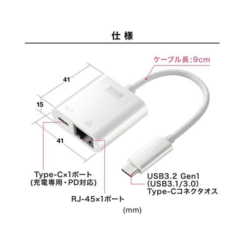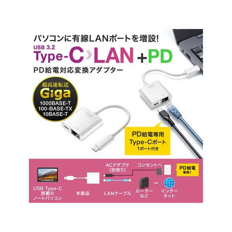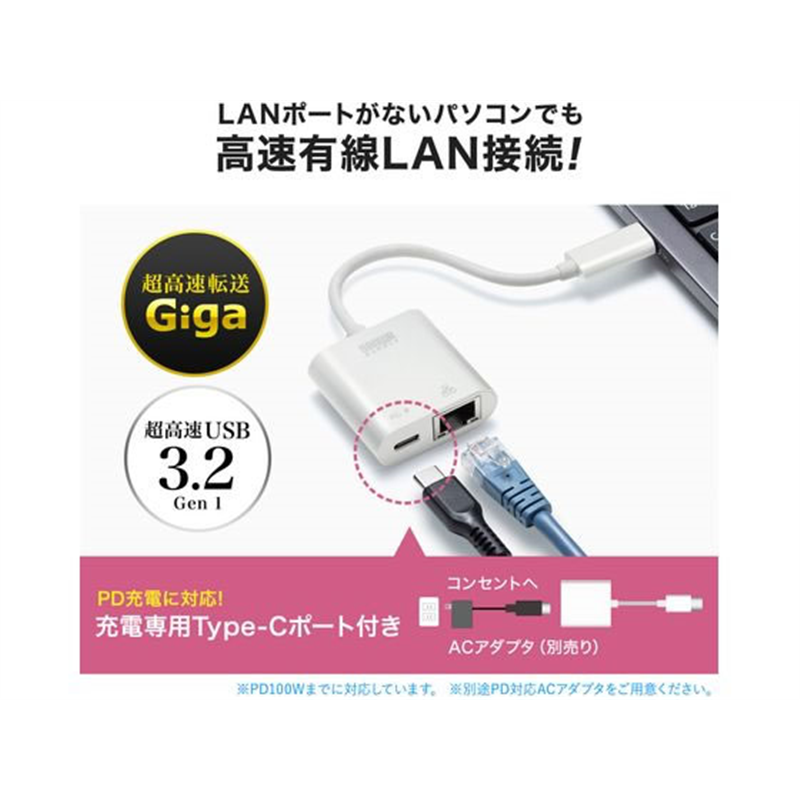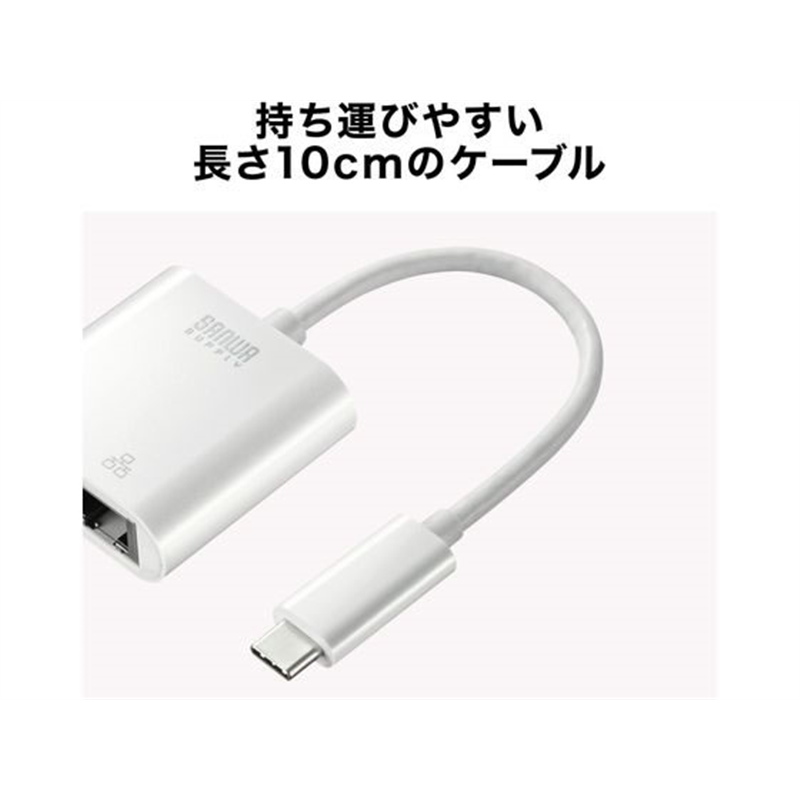 サンワサプライ USB3.2 TypeC-LAN変換アダプタ PD対応・ホワイト 1個(ご注文単位1個)【直送品】