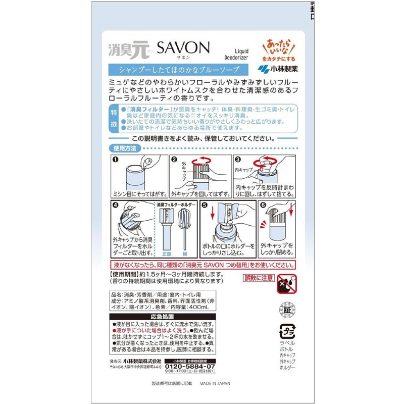 小林製薬 消臭元SAVON シャンプーしたてほのかなソープ 本体 1個(ご注文単位1個)【直送品】