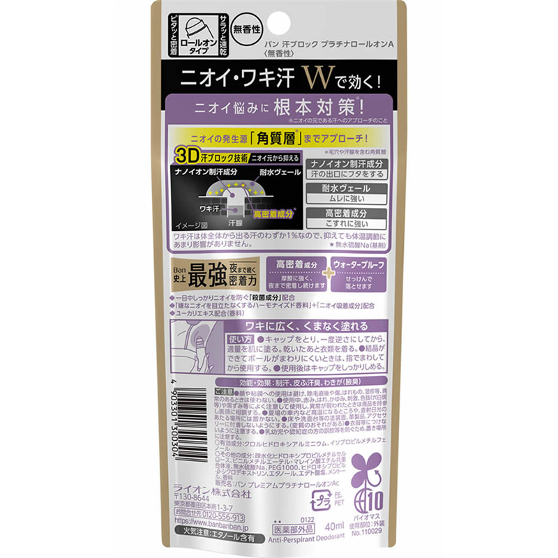 ライオン Ban 汗ブロック プラチナロールオン 無香性 40mL 1個(ご注文単位1個)【直送品】