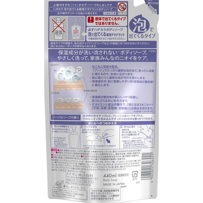 ライオン hadakara 泡で出てくる薬用デオドラントボディハーバル替 1個(ご注文単位1個)【直送品】