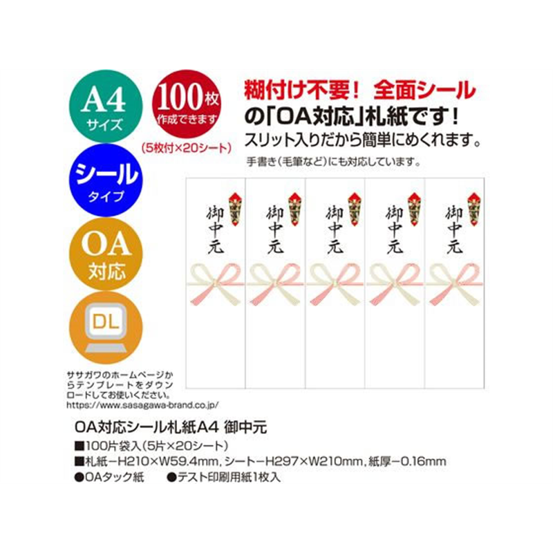ササガワ OA対応シール札紙A4 御中元 5片×20シート 24-1921 1冊(ご注文単位1冊)【直送品】