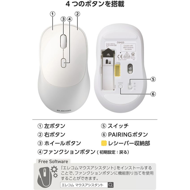 エレコム マウス マルチ接続 静音 4ボタン ホワイト M-MY20MBSXWH 1個(ご注文単位1個)【直送品】