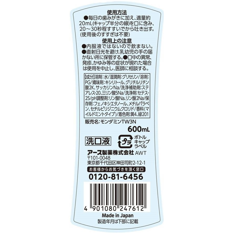 アース製薬 モンダミン マイルドミント マウスウォッシュ 600mL 1個(ご注文単位1個)【直送品】