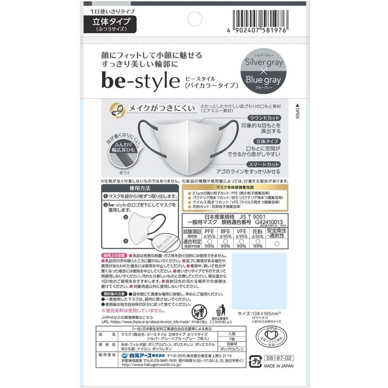 白元アース ビースタイル 立体タイプ ふつうサイズ シルバーグレー×ブル 1パック(ご注文単位1パック)【直送品】