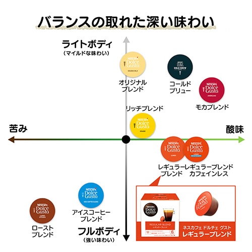 - ●【カプセル】1杯ずつ淹れるから、いつでも淹れたての味と香りが楽しめる。●種類/レギュラーブレンド●産地/コロンビア、ブラジル●製造国/ベトナム●カロリー/0kcal●成分/たんぱく質:0g、脂質:0g、炭水化物:0g、食塩相当量:0g、糖質:0g、食物繊維:0g●賞味期限/商品の発送時点で、賞味期限まで残り130日以上の商品をお届けします。●シリーズ名/ドルチェ グスト●原材料/コーヒー豆●1箱=60杯※メーカー都合により、パッケージデザインおよび仕様が変更になる場合がございます。●バランスのとれた深い味わいのレギュラーブレンド。60杯分です。●きめ細やかなクレマと共に、湧き上がる豊かで複雑な香りをお楽しみください。●香ばしさの中にカシスを思わせる味わいを感じる、非常にバランスのとれたカップです。