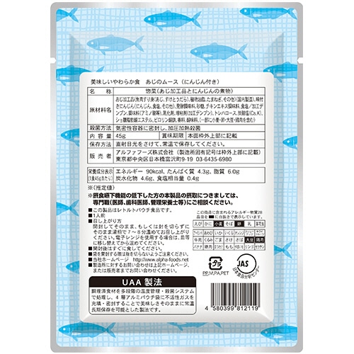 アルファフーズ UAA食品 美味しいやわらか食 あじのムース(にんじん付) 50食/袋 ※軽(ご注文単位1袋)【直送品】