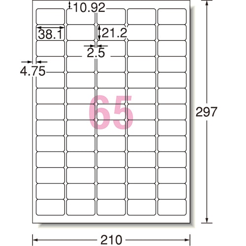 - ●水濡れに強い、光沢フィルムラベル。●サイズ/A4●シートサイズ/210×297mm●ラベルサイズ/21.2×38.1mm●面付け/65面四辺余白(角丸)●色/ホワイト●紙質/ポリエステルフィルム●総厚み/0.15mm●1冊=3シート●耐水タイプ●インクジェット用プリンターラベル●光沢フィルム・ホワイト●A4 65面