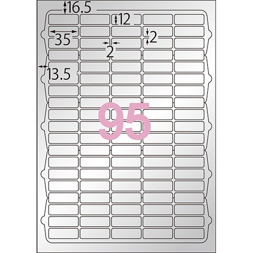- ●耐水・耐光性に優れた、屋外でも使用できるシルバーフィルムラベル●シートサイズ/A4(210×297mm)●ラベルサイズ/35×12mm●面付け/95面(5列×19段)●紙質/ポリエステルフィルム●紙色/シルバー・ツヤ消し●坪量/-●総厚み/0.13mm●ラベルの厚み/0.08mm●入り数/1冊(5シート・475片入)※厚紙モード、手差し給紙でお使いください。※お使いの機種によっては対応しない場合がございます。●耐水・耐光性に優れており、屋外での掲示に適しています。●備品整理や資産管理などにも適した、ツヤ消しシルバーのフィルム素材です。※直射日光にさらされる環境での長期使用の際は、トナーの褪色や素材の黄変が起こりますので、数ヶ月毎に貼り替えが必要です。