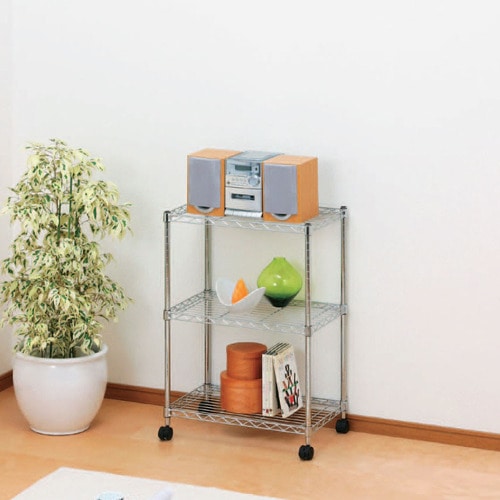 ●直径19mmのポールを使用した簡易ラック●タイプ/3段●サイズ/W550×D350×H830mm●重量/5.4kg●部材/ポール・棚板:スチール(クロームメッキ)、棚板固定部品:ABS、キャスター:ナイロン●耐荷重/棚板1枚あたり:50kg、全体(静止時):150kg、全体(移動時):75kg●キャスター付※お客様組み立て商品となります。(別途ゴムハンマーをご用意ください)※耐荷重はシェルフ1枚あたりです。●幅550mm、高さ830mmの3段タイプ。●スペースをとらない奥行350mmのコンパクト設計。●キャスター付で移動もラクラク。●セットタイプですのでパーツ選びの手間がかかりません。●棚板の位置は25mm単位で調整できます。