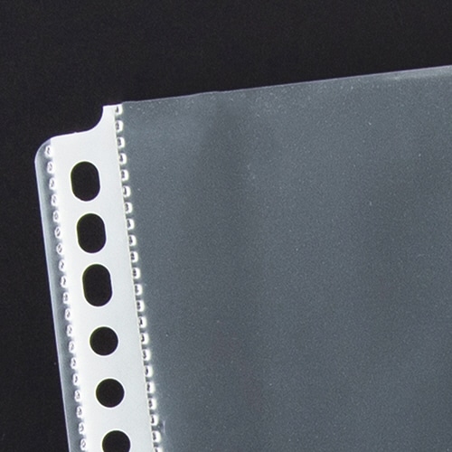 - ●大量収納でも薄型ポケットでかさばらない!!●仕様/A4タテ、2穴・4穴・30穴対応●サイズ/ポケット外寸:タテ302×ヨコ230mm、ポケット内寸:タテ300×ヨコ214mm●材質/再生ポリプロピレン(エンボスあり、浅めのエンボスになっています。)●台紙なし●厚さ/0.04mm●1パック=100枚入※とじ穴部分を補強しています。※印刷物はよく乾かしてから入れてください。印刷物によっては化学反応を起こし、変形する場合があります。●弱エンボス加工のクリヤーポケット。A4タテ、2・4・30穴対応、100枚入です。