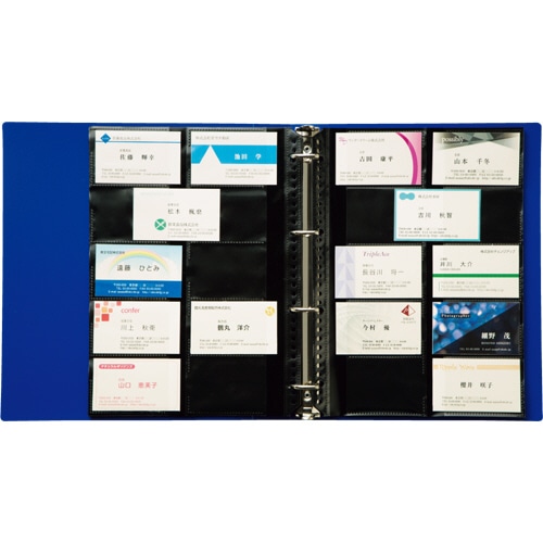 - ●【差替式】両面使える背見出し紙付。●サイズ/A4タテ●色/ブルー●寸法/W265×D40×H315mm●収容枚数/360名●収納タイプ/両面・ヨコ●最大リフィル収容枚数/38枚●穴数/4穴●対応リフィル/TNR-BK●リフィル仕様/両面ポケットタイプ●背見出し差替式●材質/表紙:再生ポリプロピレン、とじ具:スチール、リフィル:再生ポリプロピレン●A4タテ、360名収容の差し替え式名刺ホルダーの青です。