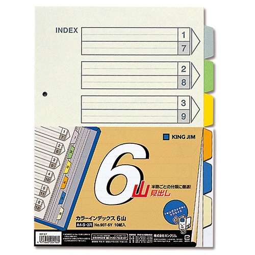 キングジム カラーインデックス A4タテ 2穴 6色6山+扉紙 907-6Y 10組/袋(ご注文単位1袋)【直送品】