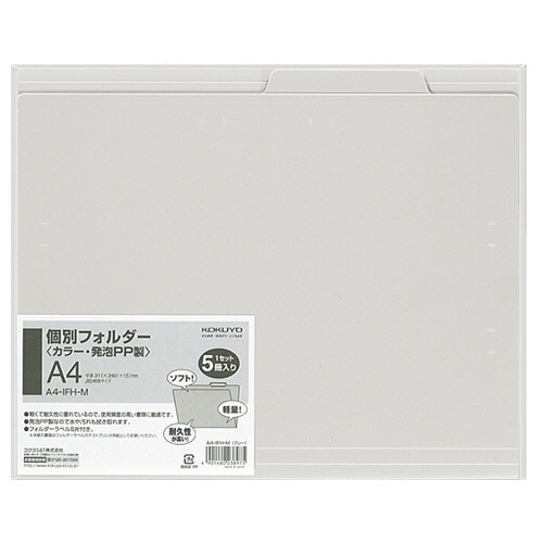 - ●耐久性・耐水性に優れた樹脂製の個別フォルダー。●サイズ/A4●色/グレー●寸法/タテ240(+15)×ヨコ311mm●山サイズ/×高さ約15mm●材質/発泡PP(発泡R-PP40%)●厚さ/約0.75mm●重量/52g●1セット=5冊×6パック※ファスナー用スリットあり(両面で16ヵ所)※保存年限や活用期間を記入する欄は印刷されていません。●色はグレー、5冊×6パックです。●耐久性に優れているため、使用頻度の高い書類のファイリングに好適。また、研究所や工場などでの使用にも向いています。●水をはじき汚れも拭き取りも可能なPP製。●発泡PP製ファイルボックスと合わせた丈夫なファイリングが可能。●フォルダーラベル付き