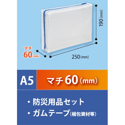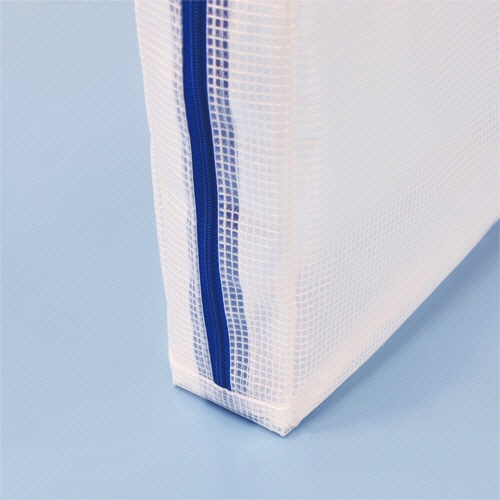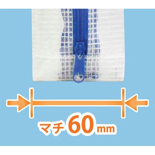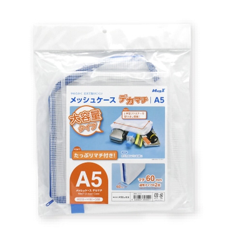 - ●L型チャック+マチ付で大収納力。●仕様/メッシュタイプ●サイズ/A5●色/青●寸法/タテ190×ヨコ250mm●マチ幅/60mm●厚さ/0.3mm●材質/PEVA●たっぷり収納デカマチタイプ!A5サイズです。●丈夫なメッシュ加工。