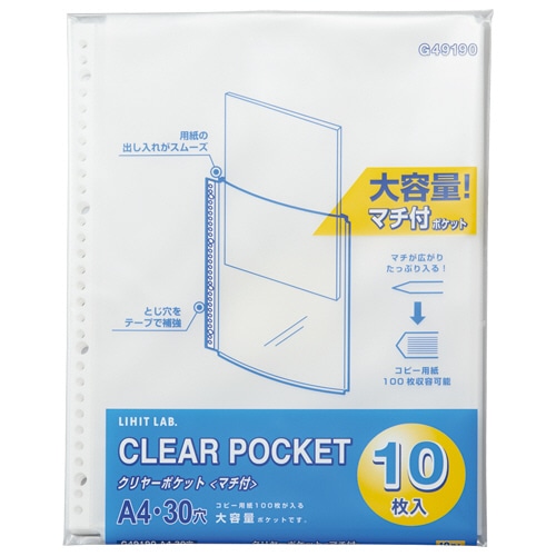 リヒトラブ リクエスト クリヤーポケット(マチ付タイプ) A4タテ 2・4・30穴 台紙なし G49190 10枚/袋(ご注文単位1袋)【直送品】
