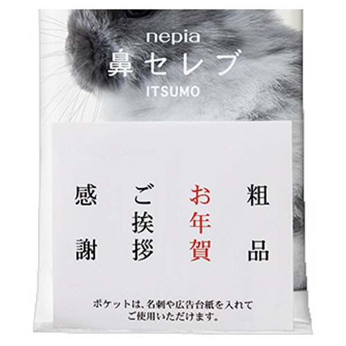 - ●貰ってうれしい「ごあいさつ」ティシュ。●内容量/96(48)枚(組)●パッケージサイズ/W125×D225×H15mm●材質/パルプ100%●生産国/日本●シリーズ名/ネピア●内容物の最大サイズ/115×90mm●1パック=10個●贈答用ティッシュの10個パック●名刺やアドカードを挿し込めるポケット付。●ごあいさつに使えるシール付属。