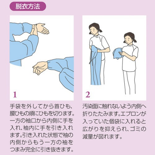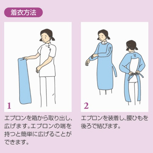 - ●ポリエチレン製で水分を通さず、長袖のためバリア性に優れています。●材質/ポリエチレン●サイズ/大きめ(裾まわり90×丈125cm)●1箱=10枚入●湿性生体物質(血液、体液など)や薬液などが飛散する可能性がある場合に使用するプラスチックエプロンです。●背面はひも結びタイプです。