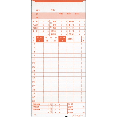 アマノ 標準タイムカード Aカード 月末締/15日締 100枚/袋(ご注文単位1袋)【直送品】