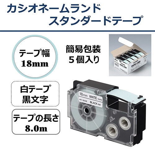 カシオ NAME LAND スタンダードテープ 18mm×8m 白/黒文字 XR-18WE-5P-E 10個/箱(ご注文単位1箱)【直送品】