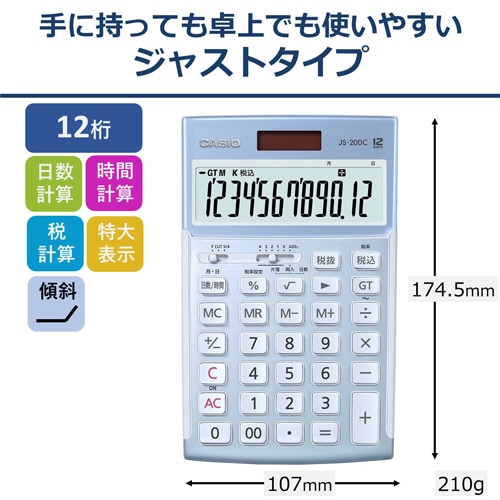 カシオ 本格実務電卓 日数&時間計算 12桁 ジャストタイプ ブルー JS-20DC-BU-N 1台(ご注文単位1台)【直送品】
