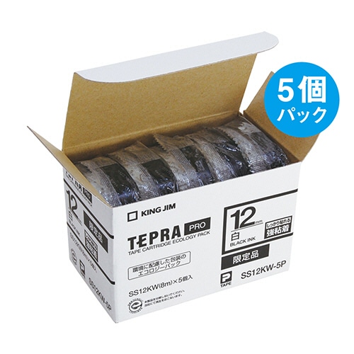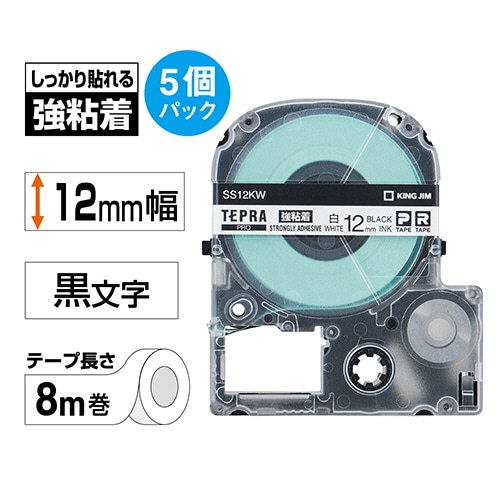 キングジム テプラ PRO テープカートリッジ 強粘着 12mm 白/黒文字 SS12KW-5P 5個/袋(ご注文単位1袋)【直送品】