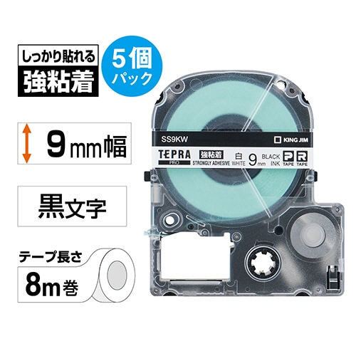 キングジム テプラ PRO テープカートリッジ 強粘着 9mm 白/黒文字 SS9KW-5P 5個/袋(ご注文単位1袋)【直送品】