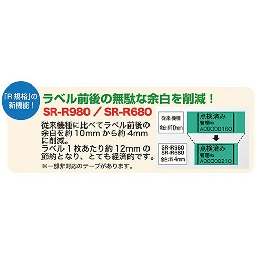 - ●「テプラ」PRO SR-R980の通販セット●寸法/W約195×D252×H101mm●重量/約1260g●色/ブラック●対応テープ幅/4~36mm●最大印刷可能幅/30.5mm●印刷改行数/1~14行●定長印刷/1.4~95cm●入力方式/JIS配列キーボード式(かなめくり方式)●液晶/15文字×5行●印字精細度/360dpi・432dot●内蔵文字数/8327文字、JIS第1:2965文字、JIS第2:3390文字、かな・英数字・記号等●文章ファイル/約10000文字、最大100ファイル●機能/ピック&プリント、定長、みえ2&プレビュー、印刷履歴(10件)、連続印刷、あて名登録、2WAY電源、高速印刷、コピー&貼付け、予測入力、テープ品種自動検出、余白削減●カッタータイプ/ハーフカット機能付きオートカッター●オートトリマー/9~36mm●書体/漢字11書体、かな15書体、英数19書体●外枠/136種(記号外枠・カットラベル含む)●パソコン接続/対応●インターフェース/USB接続●対応OS/Windows 11/10/8.1、Mac OS 10.15以降●電源/ACアダプタ、単3形アルカリ乾電池×6本(別売)または単3形ニッケル水素電池×6本(別売)●付属品/USBケーブル(USB2.0/1.1ケーブ●USBケーブル(USB2.0/1.1ケーブル A-Bタイプ)同梱。ビジネスに便利なフォームを多数搭載した「テプラ」フラッグシップモデル「テプラPRO SR-R980」。●高速印刷&静音設計!便利な機能が満載!●ラベルを印刷した際の無駄な余白が少なくなりました。ラベル1枚につき、前後の余白が約10mmから約4mmに短くなります。1本のカートリッジからより多くのラベルを作成できるようになり経済的です。(一部非対応のテープがあります。余白やカットの設定などにより削減幅は異なります。)●連続印刷時に、ラベルを引き抜くと次のラベルが印刷される「ピック&プリント機能」を搭載。ケーブルの配線作業や、オフィスでは取引先別に用意する請求書の宛名など、1枚1枚貼り間違いがないよう確認しながらラベル貼りをするシーンで活用できます。●テープエンド検出&印刷再開機能。●バックライト付きで見やすいディスプレイ。●予測機能付きATOK搭載。●お名前タグ印刷、ピッとコード印刷機能を搭載。