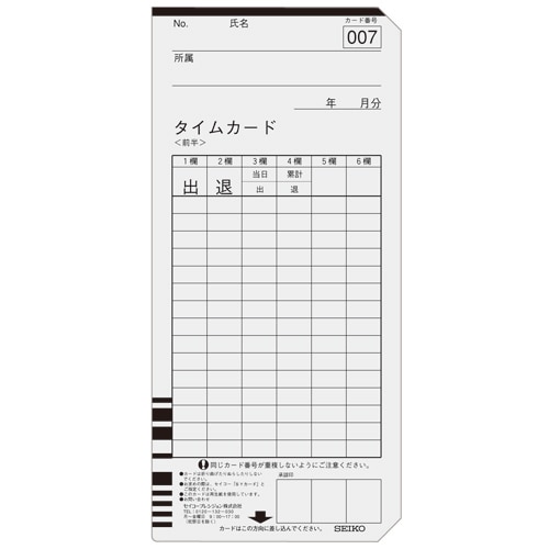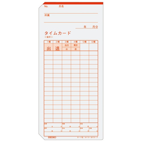 ●両面6欄・全締め日対応。●仕様/両面6欄・全締め日対応●1箱=100枚入※セイコーYカード(CA-Y)の代替としても使用可能です。●1枚ごとに「001」番から「100」番までのカード番号およびバーコード印刷あり