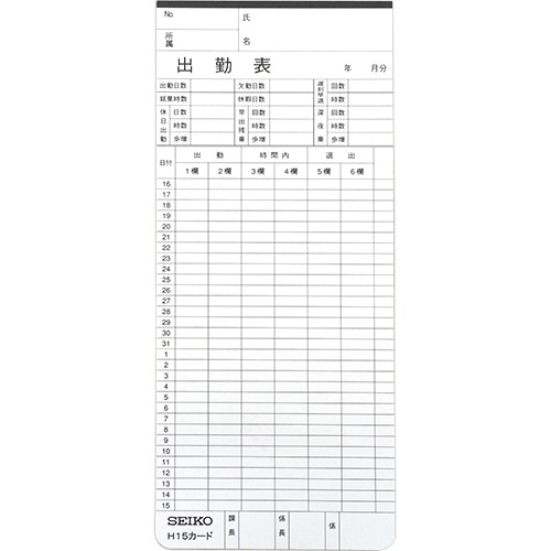 セイコーソリューションズ セイコー用片面タイムカード 15日締 6欄印字 CA-H15 100枚/袋(ご注文単位1袋)【直送品】