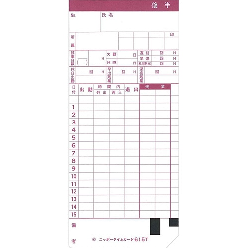 ニッポー 標準タイムカード 15日締 615T 100枚/袋(ご注文単位1袋)【直送品】